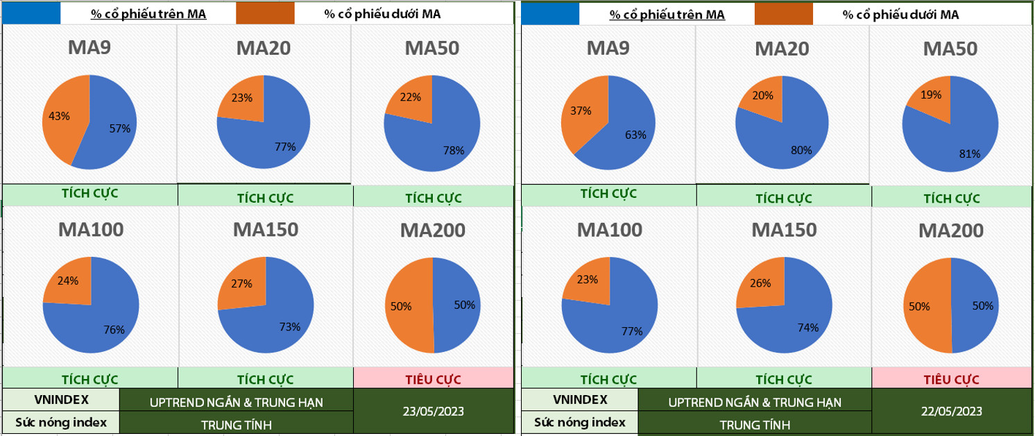 % Cổ phiếu nằm trên MA20 sụt giảm nhẹ so với phiên qua tuy nhiên nhìn chung xu hướng vẫn tích cực. Tương tự là % cổ phiếu trên MA50 & MA200 vẫn duy trì vị thế tích cực.