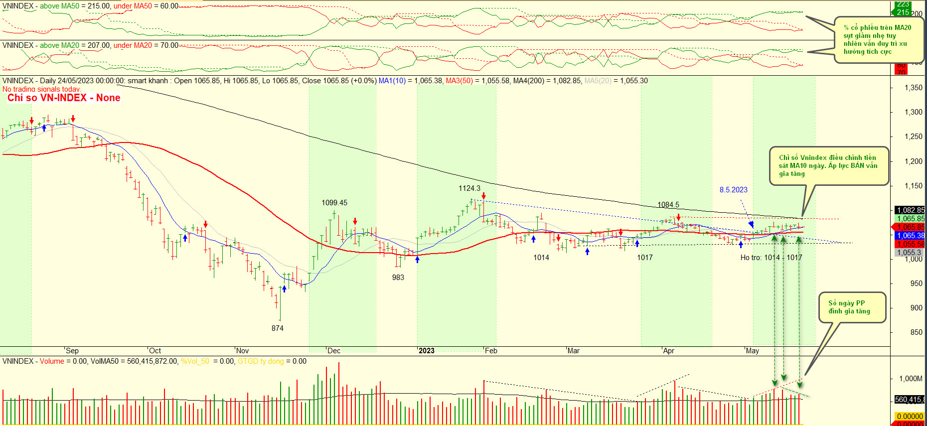 Với việc Vnindex liên tục kéo xả diễn ra liên tiếp trong khoảng 10 phiên vừa qua & xu hướng SELL chủ động tăng lên cá nhân em cho rằng index có khả năng sẽ cần một nhịp chỉnh ngắn về kiểm định lại hỗ trợ tại MA50 ngày ( Mốc 1055 điểm – Điều chỉnh -10 điểm so với hiện tại).