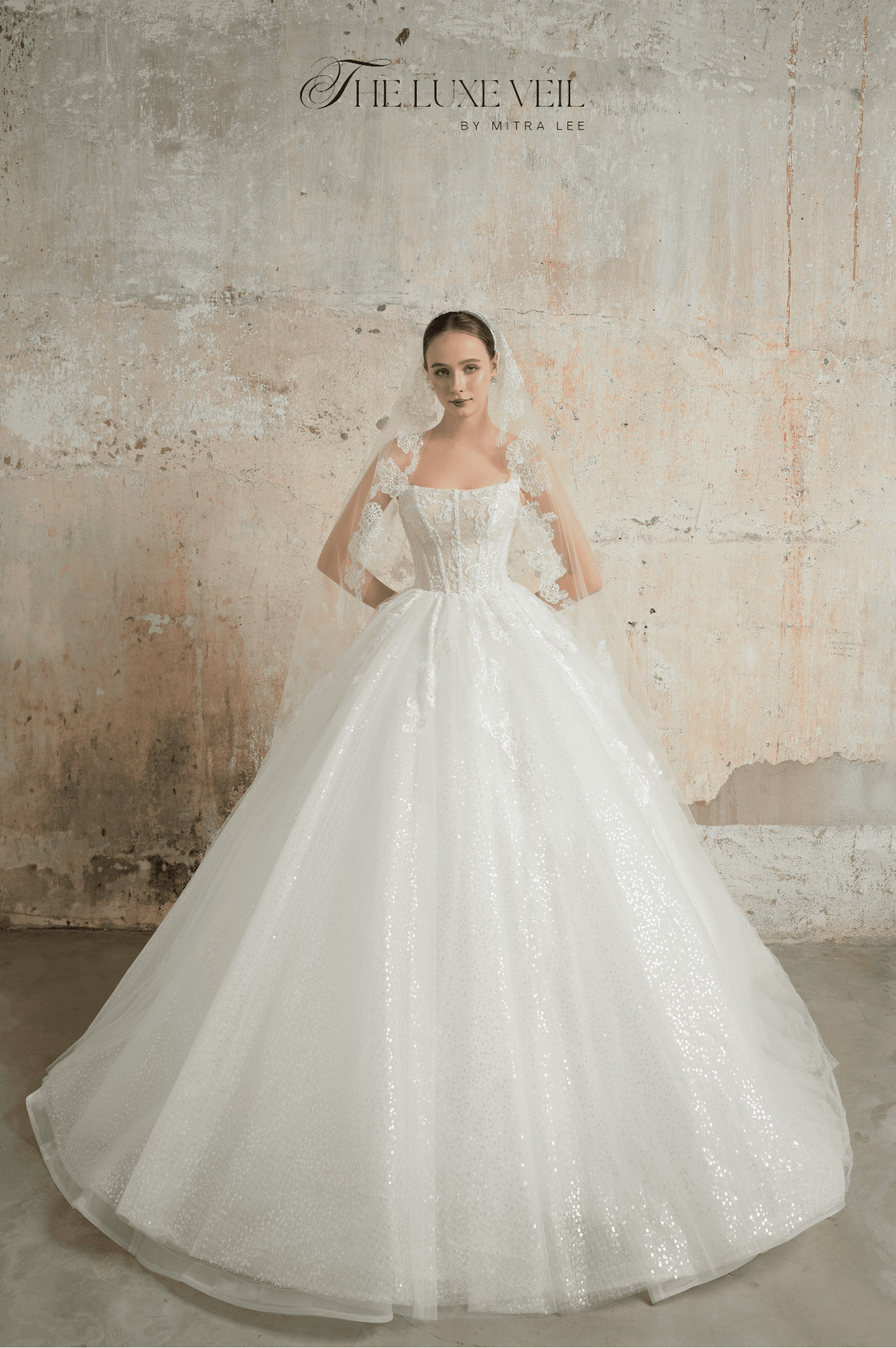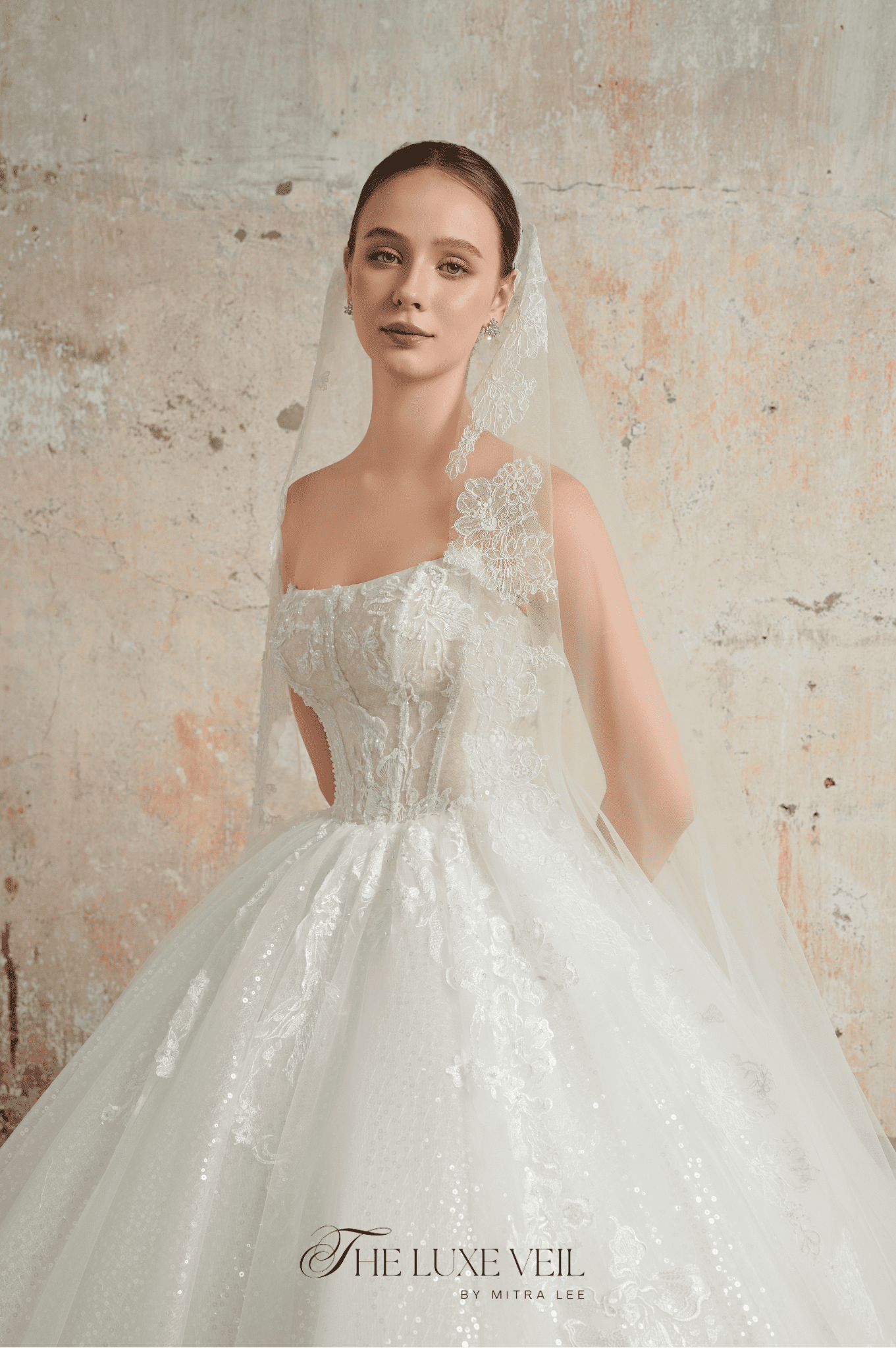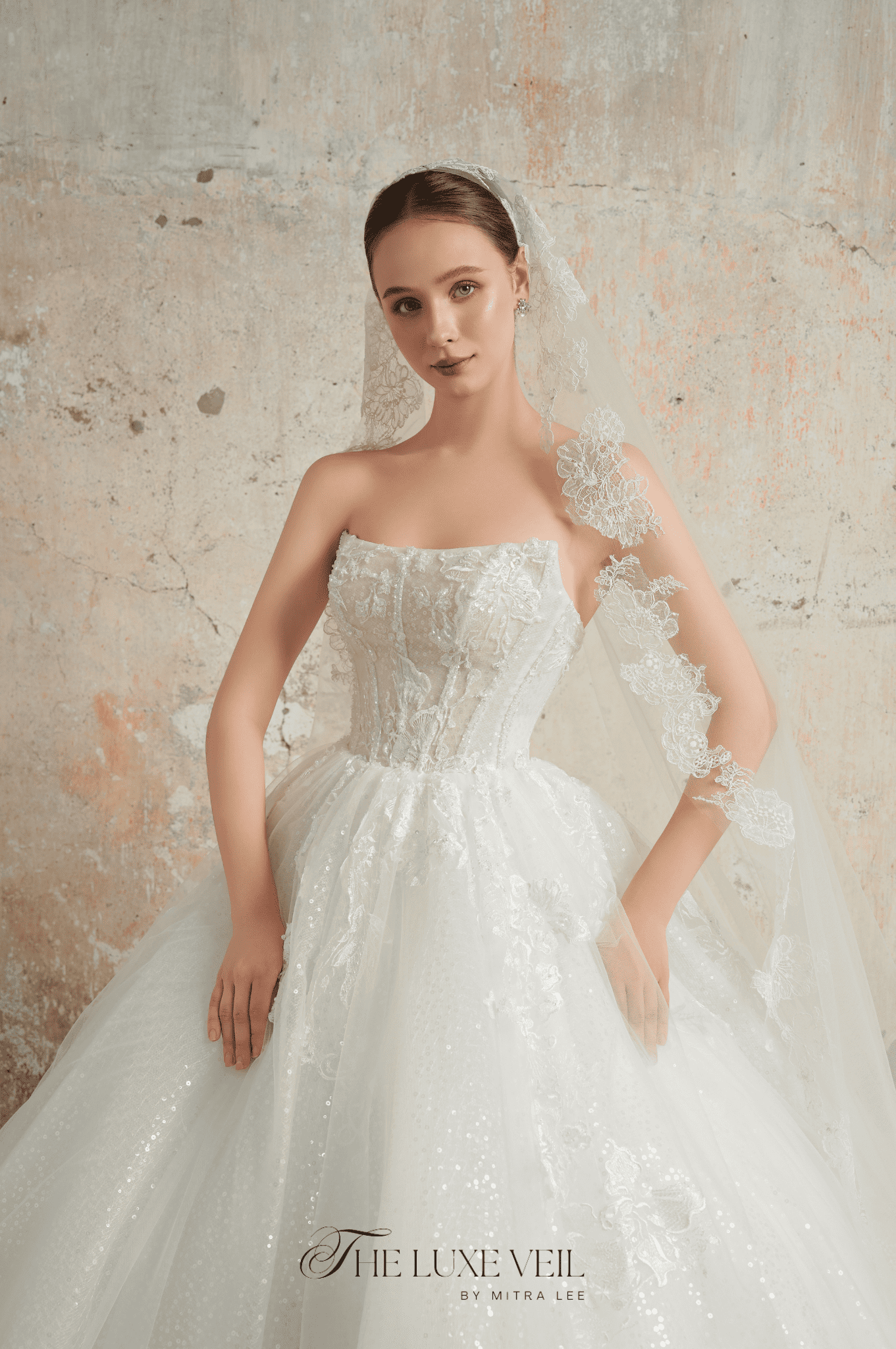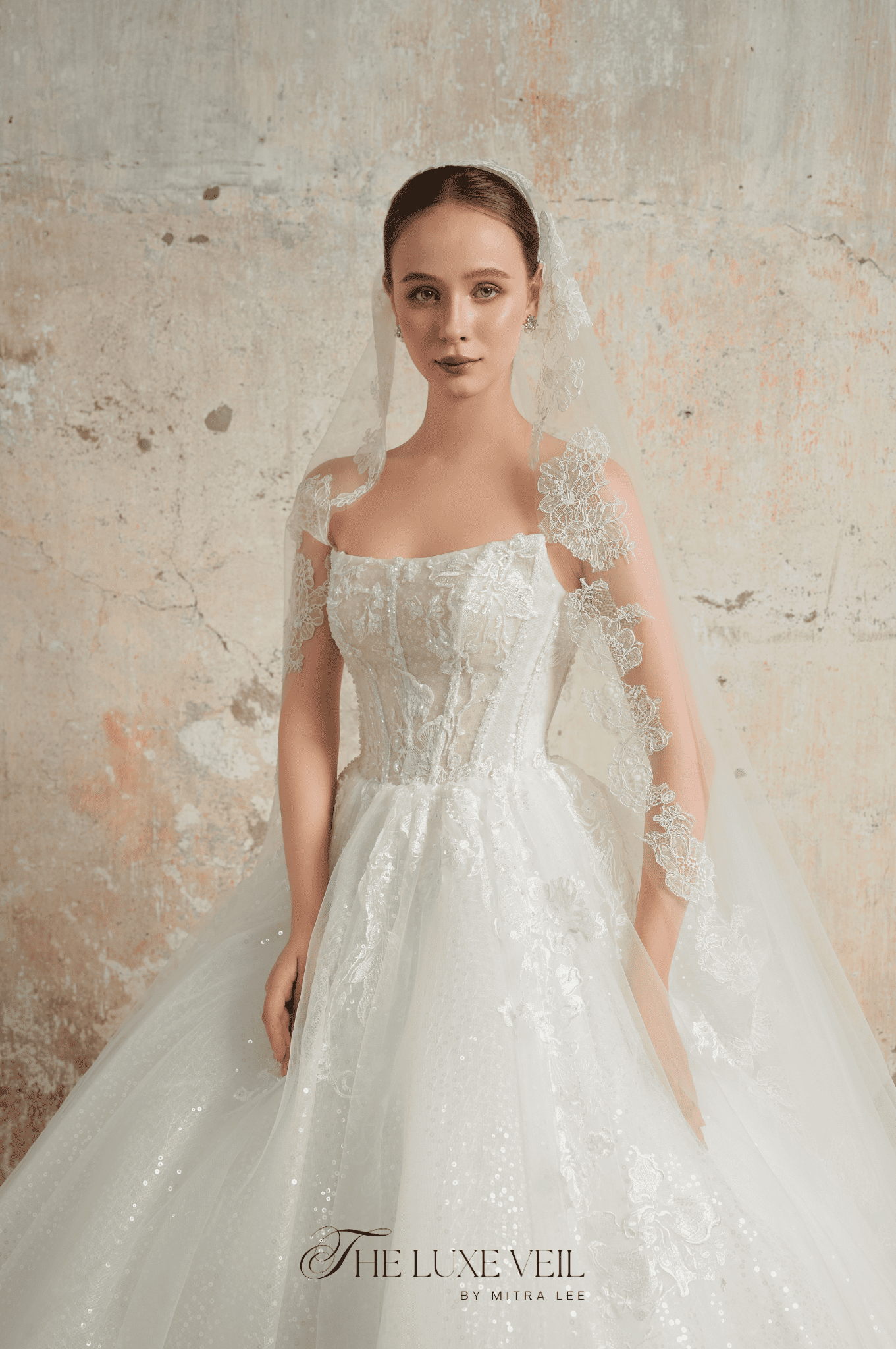Step into the enchanting world of The Gilded Aurora, where sunlight kisses every petal and leaf delicately embroidered on its bodice. This ballgown evokes the first light of dawn, symbolizing new beginnings and everlasting hope. Every shimmering detail tells a story of love’s brilliance, from the intricate floral lace trailing down the voluminous skirt to the soft veil that dances like morning mist. This dress was made for the bride who dreams of a wedding day bathed in the glow of timeless romance. With The Gilded Aurora, be the light that fills the room.