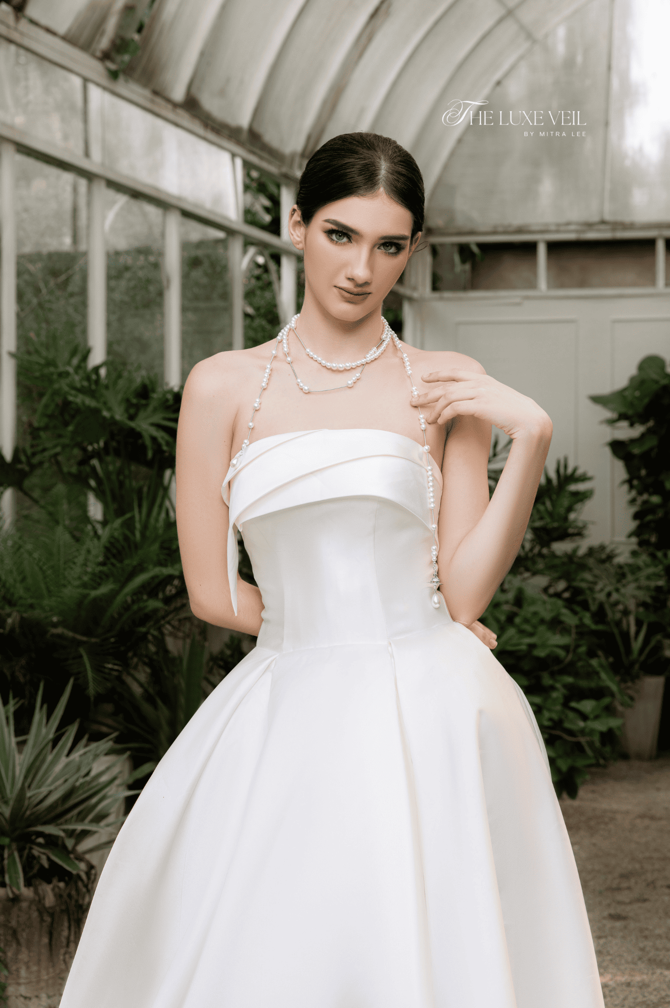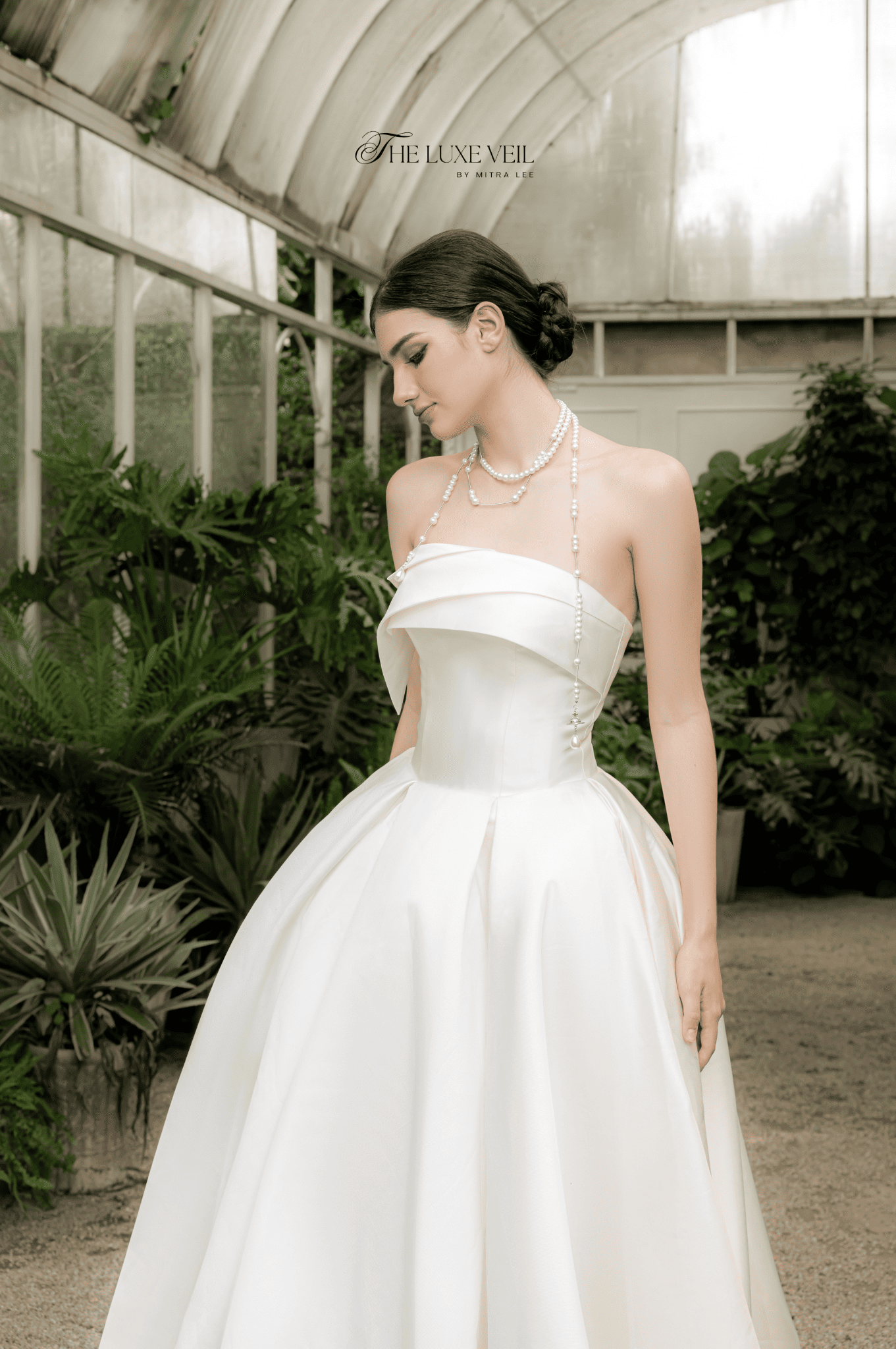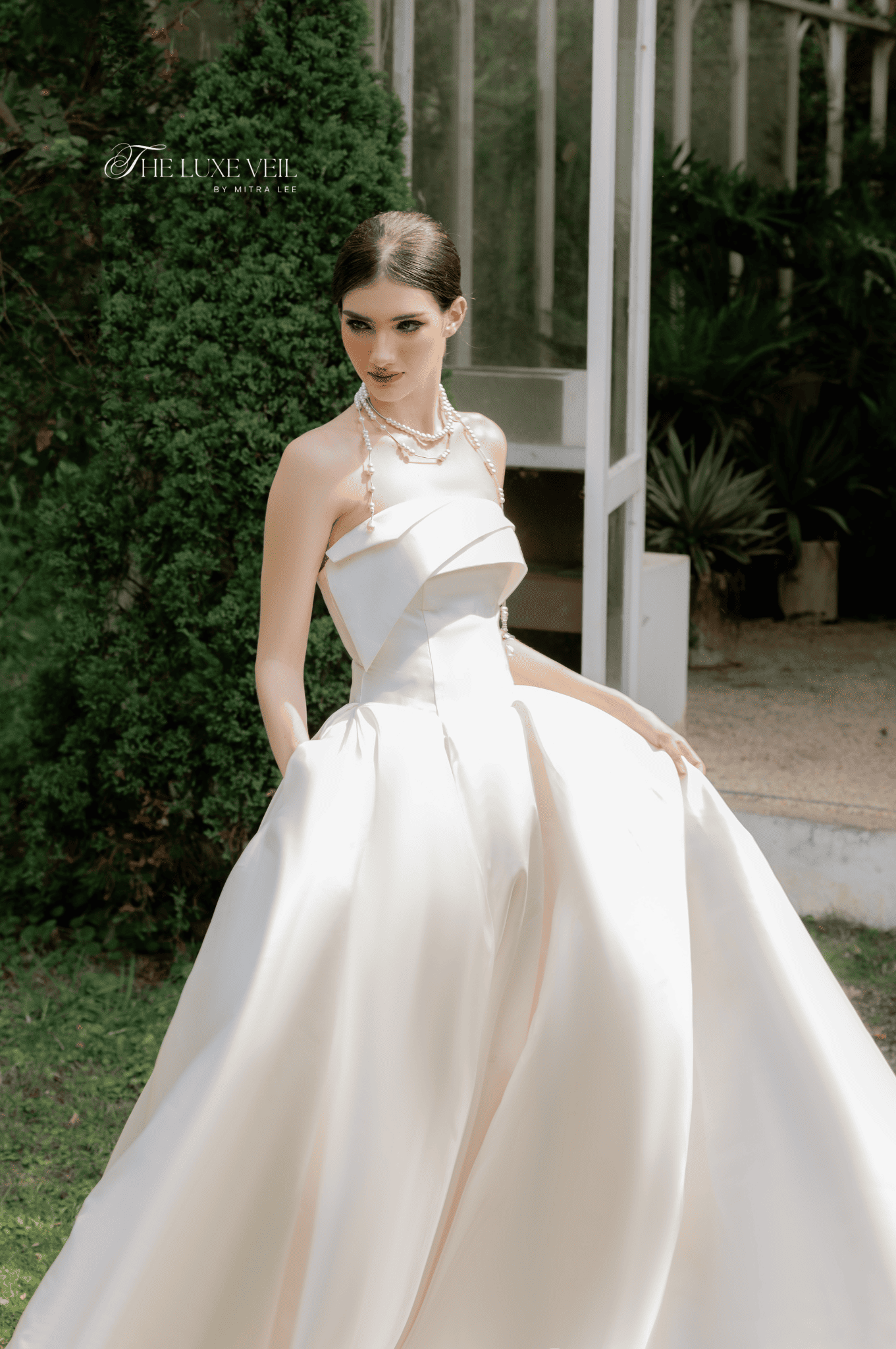 Sculpted in luminous satin, Isadora is the embodiment of quiet majesty. With its structured bodice and elegant curved neckline, this gown celebrates form, finesse, and femininity. The voluminous skirt flows like liquid silk, creating a breathtaking silhouette that moves with weightless grace. A strand of delicate pearls drapes around the bride’s neck, adding a whisper of vintage romance to an otherwise modern design. Isadora is a gown made not to follow the moment but to become a moment. A dress for the bride who stands still in a room and turns time.