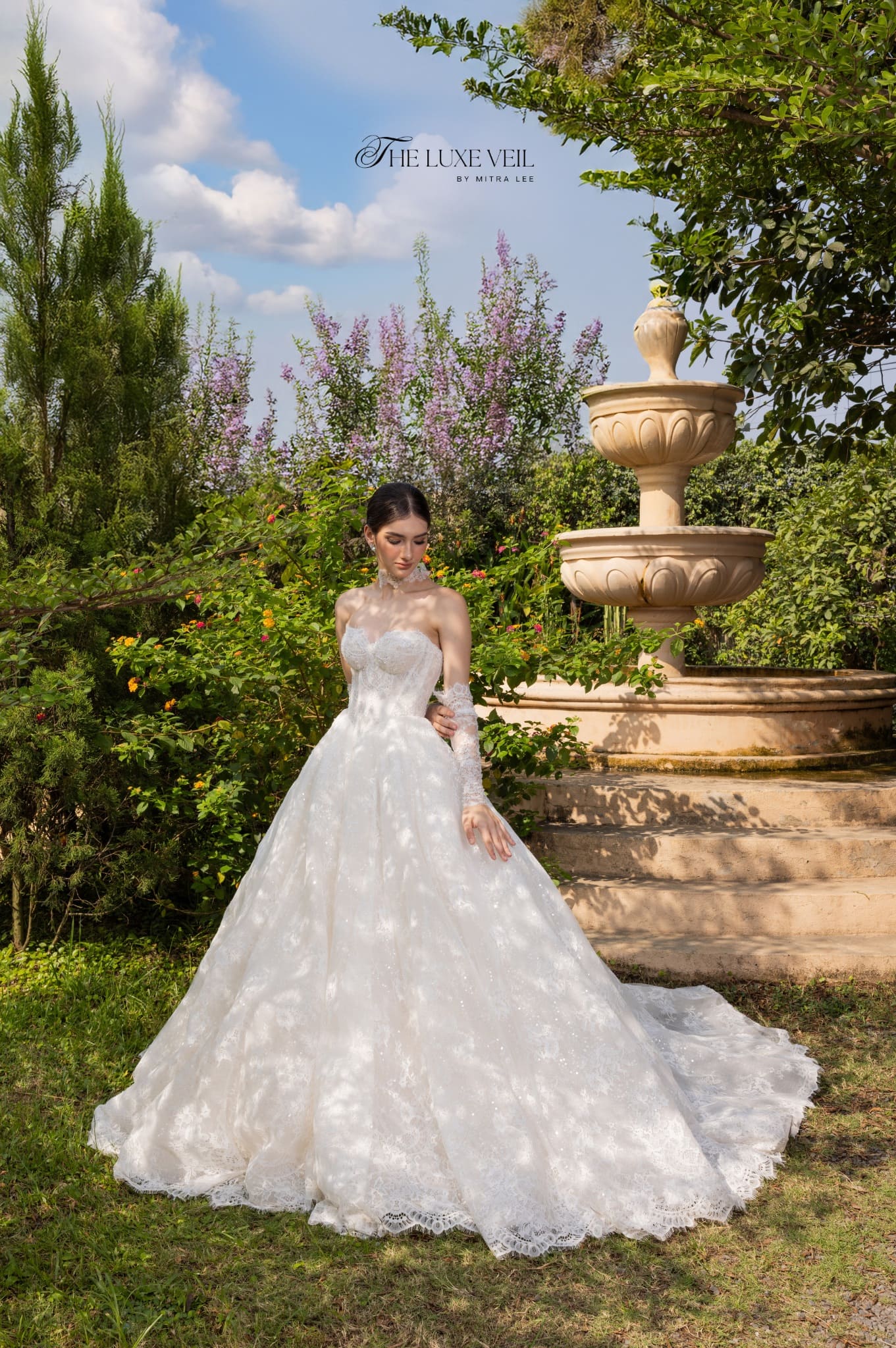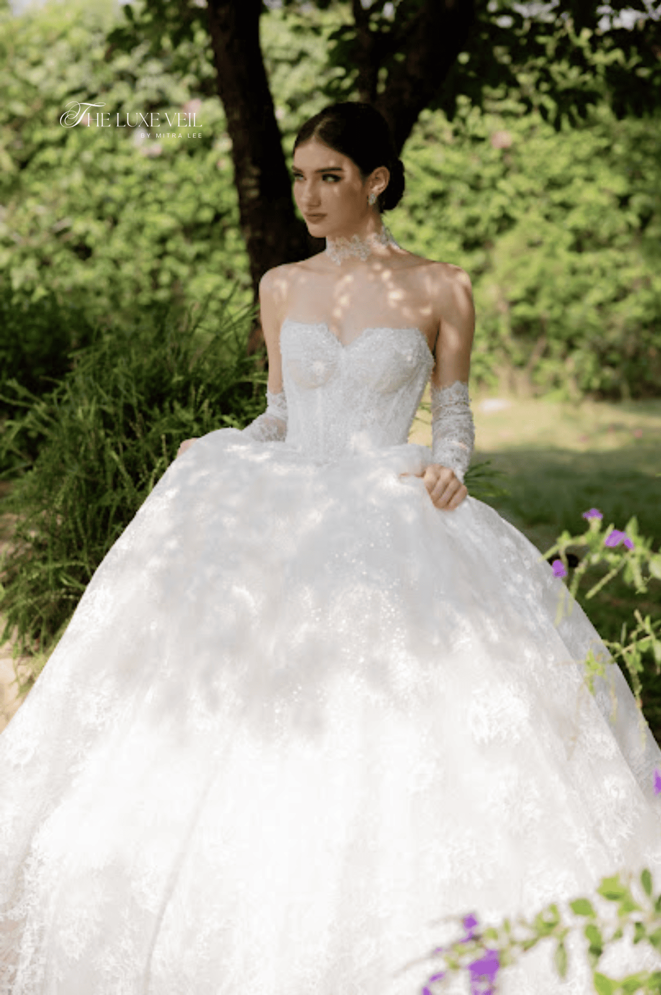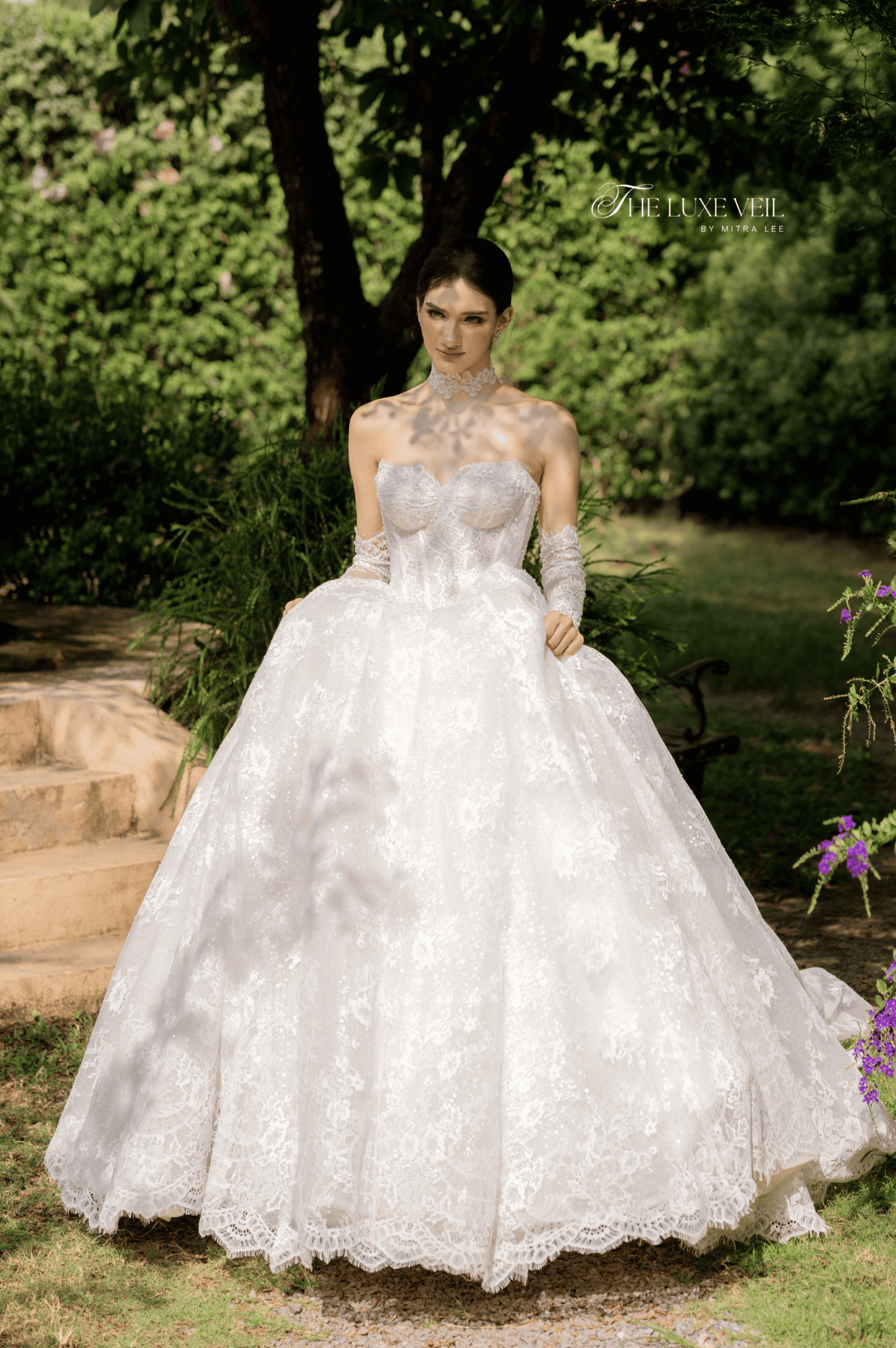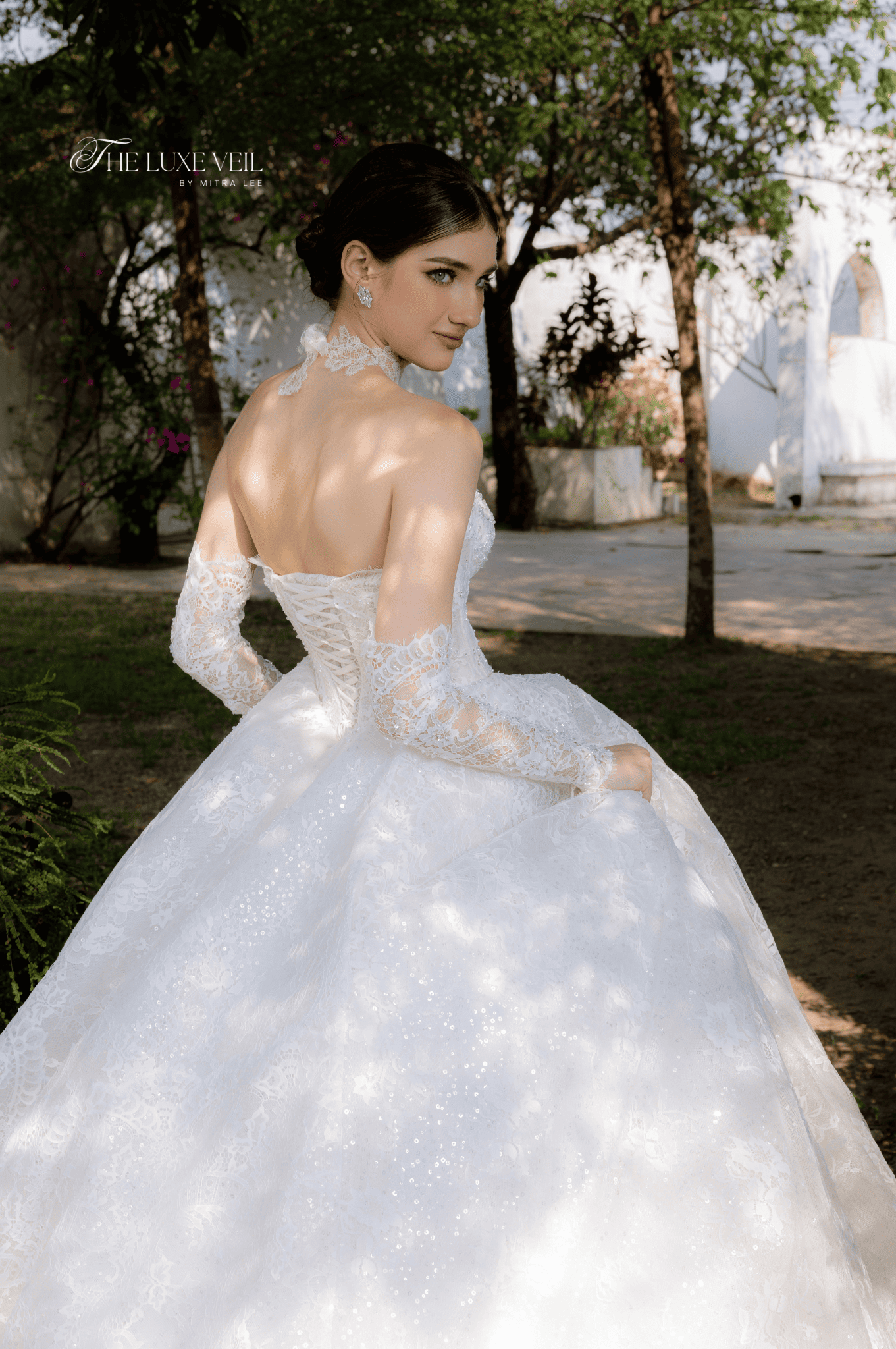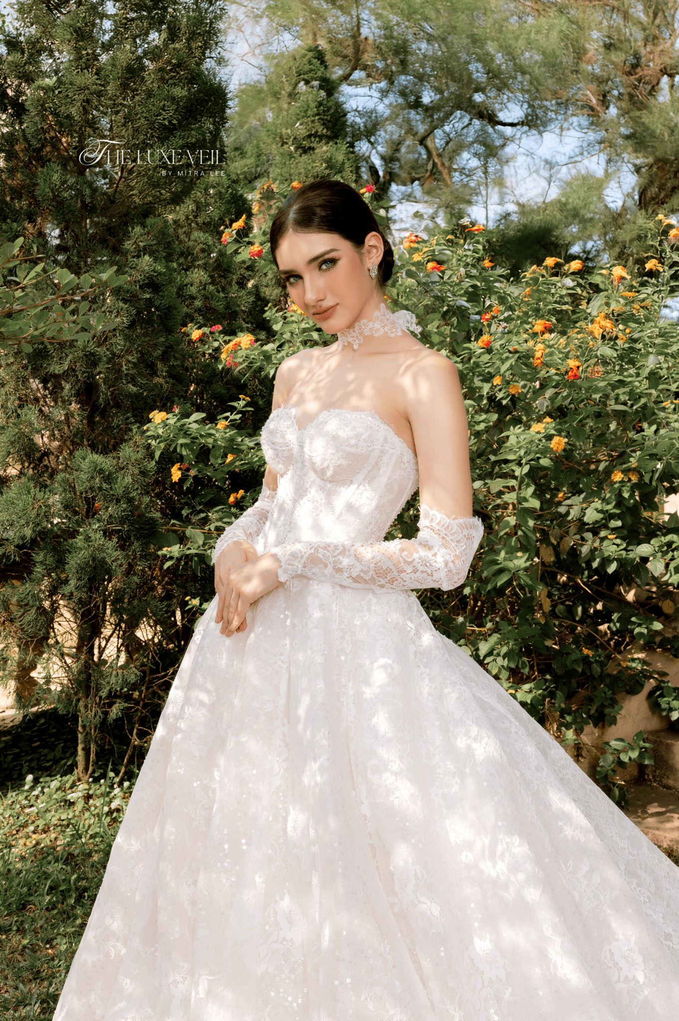 With every pearl and lace detail, Seraphina is a work of bridal poetry, an ode to romance in its most majestic form. The corseted bodice, adorned with subtle sparkle and delicate boning, sculpts the figure like a dream, while the soft sweetheart neckline offers a timeless allure. Paired with matching lace gloves and an elegant high choker, this gown is more than a bridal look, it’s a transformation. The bride becomes a vision of nobility, crowned not with a tiara, but with quiet confidence and enduring beauty. The intricate craftsmanship speaks not only of elegance, but of power, femininity, and grace woven into every thread.