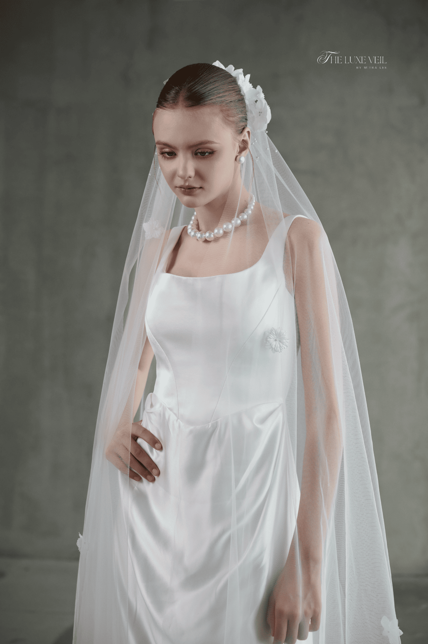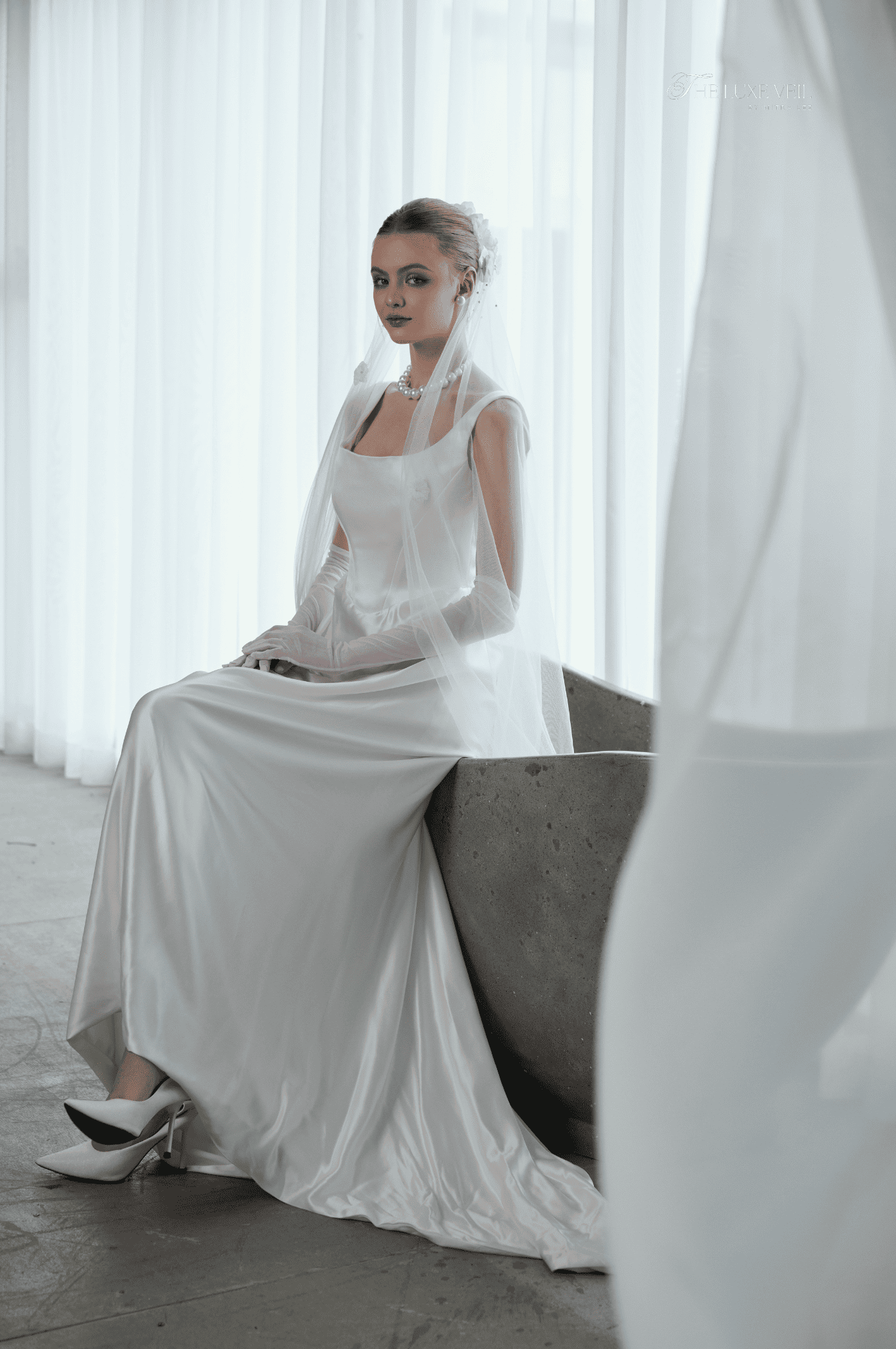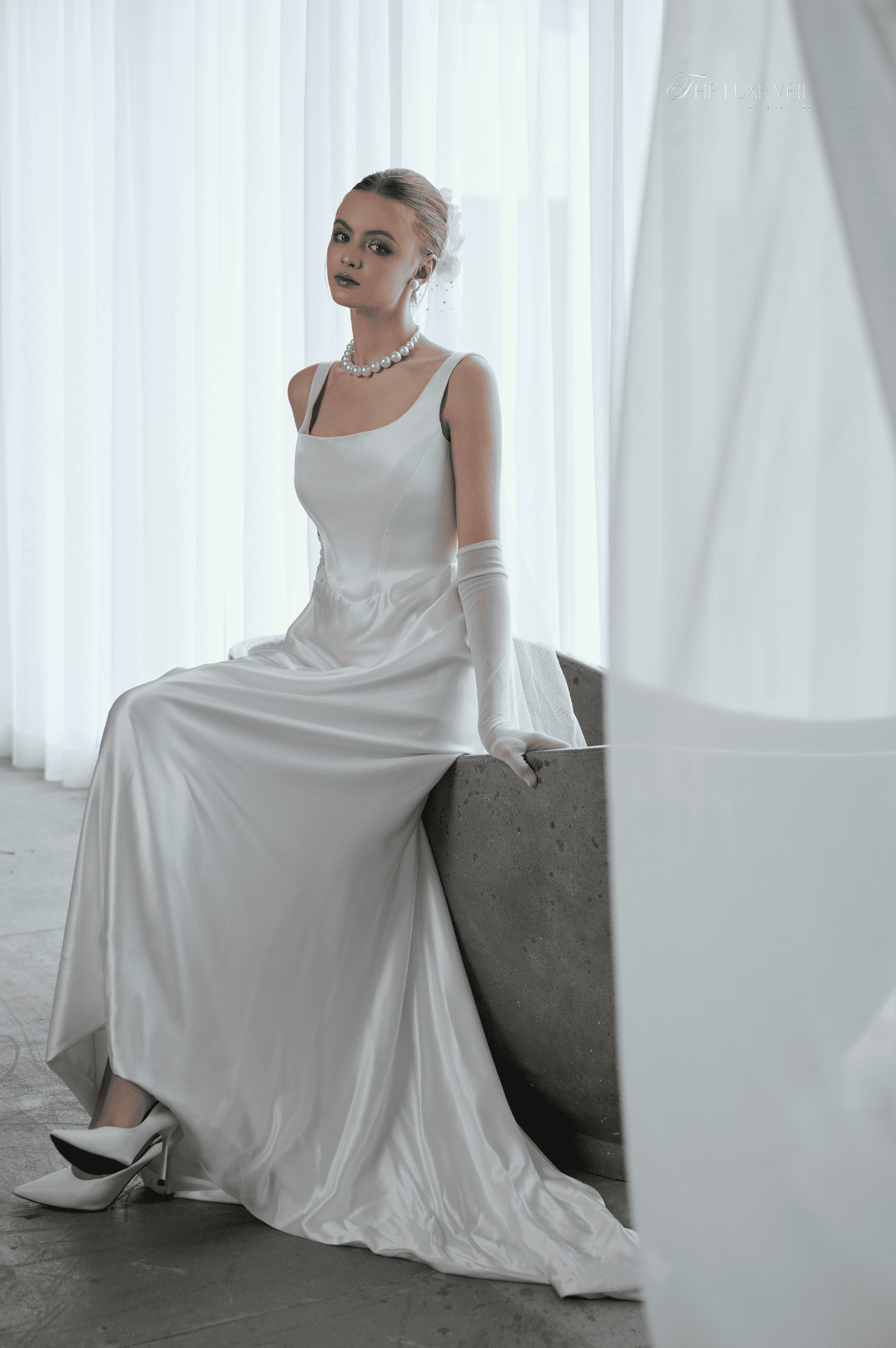 The Eloise gown is crafted in liquid satin, draping with a subtle sheen that moves like poetry under the light. Its clean square neckline frames the collarbone with quiet sophistication, while delicate straps and a softly cinched waist create a silhouette that feels both modern and eternal. A veil of gossamer tulle trails gently behind, adding a whisper of romance to the gown’s minimalist structure. Every detail from the pearl-kissed accessories to the fluid fall of satin is designed for the bride who believes that luxury doesn’t need to shout; it lingers in refinement, in purity, in presence. Eloise is not just a gown, she is a statement of serene grace for the bride who captivates without effort, and commands attention in stillness.