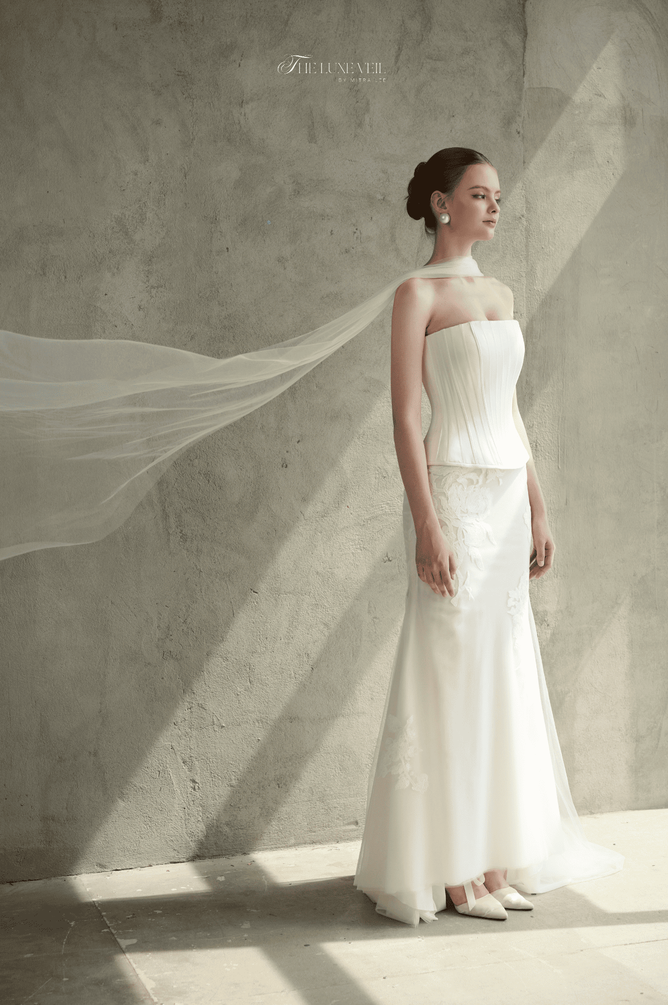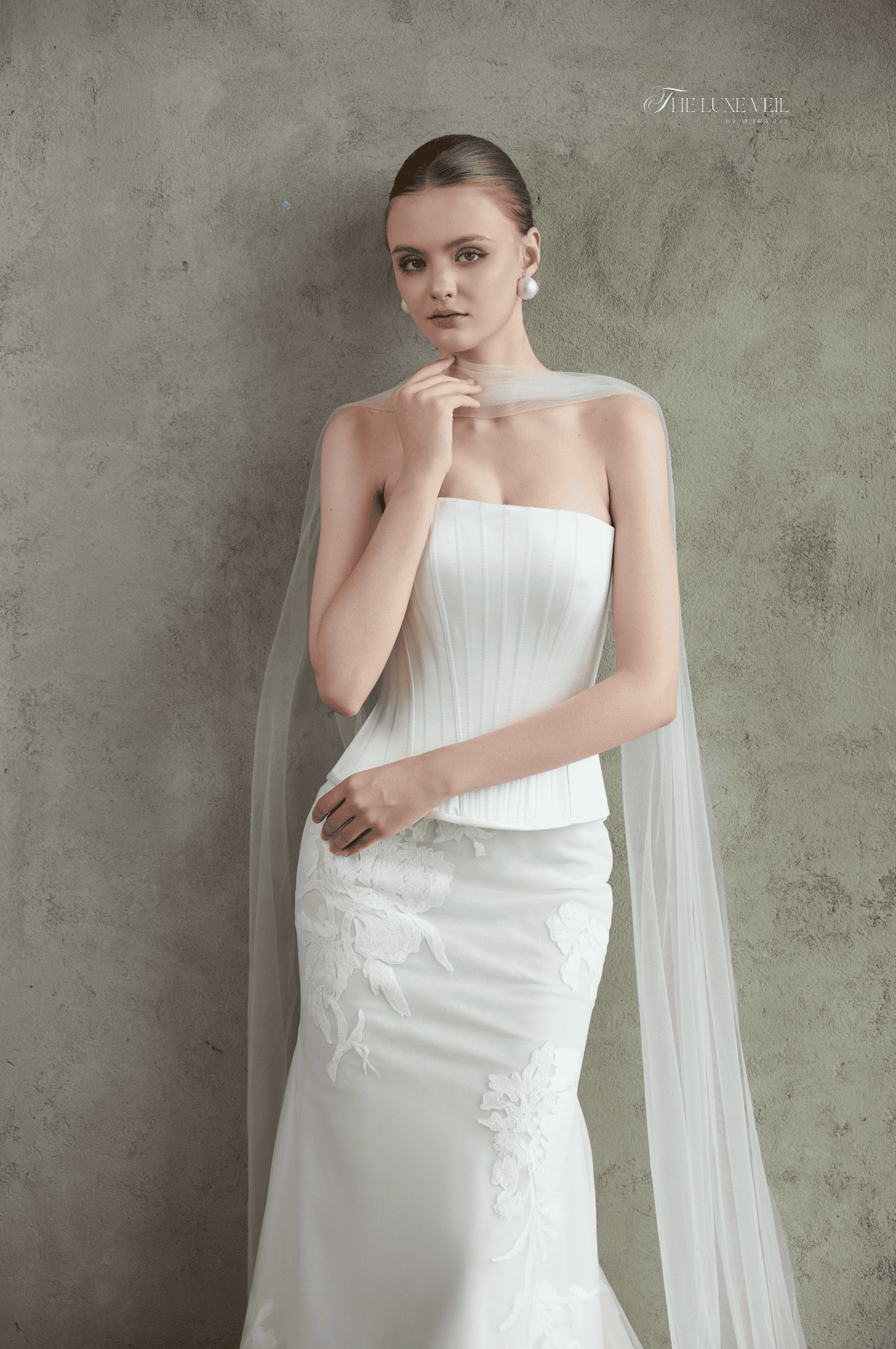 Selestine is the gown of celestial grace where structure meets serenity. The sleek corset bodice sculpts with modern precision, while delicate floral appliqués soften the silhouette with a whisper of romance. Its clean lines and fluid drape embody quiet luxury, making every step a study in elegance. Paired with a sheer, weightless veil, Selestine becomes more than a gown. It is a luminous presence, crafted for the bride who embodies strength, softness, and timeless beauty all at once.