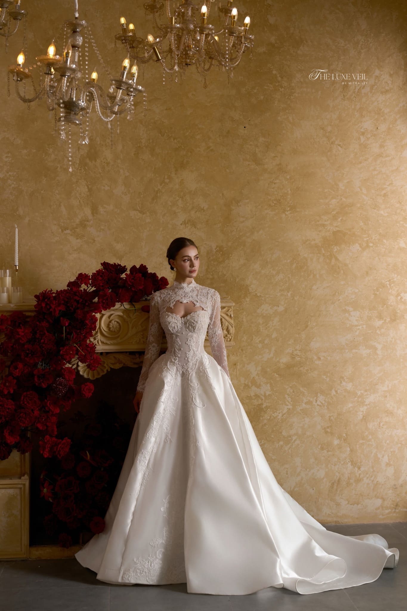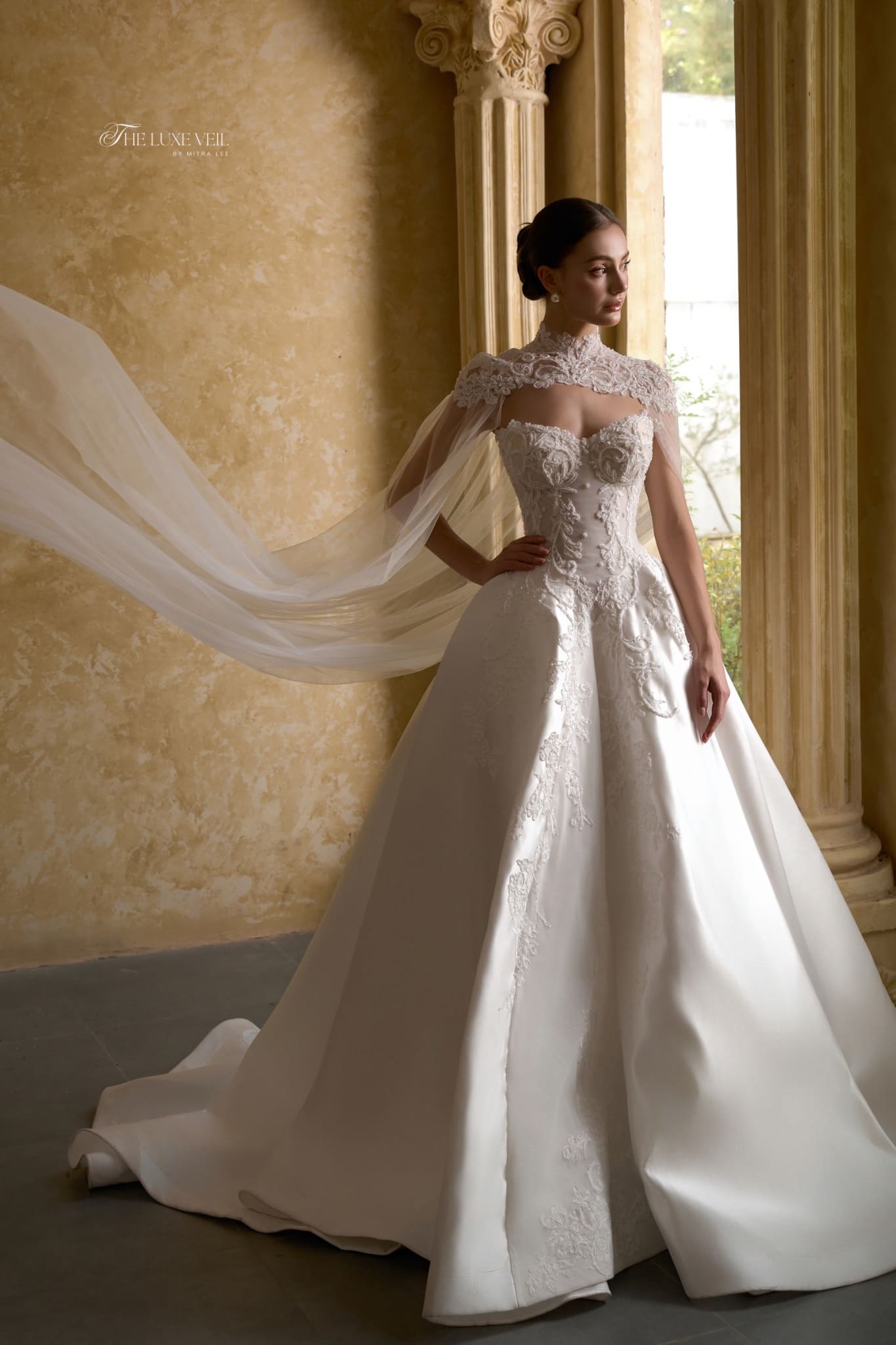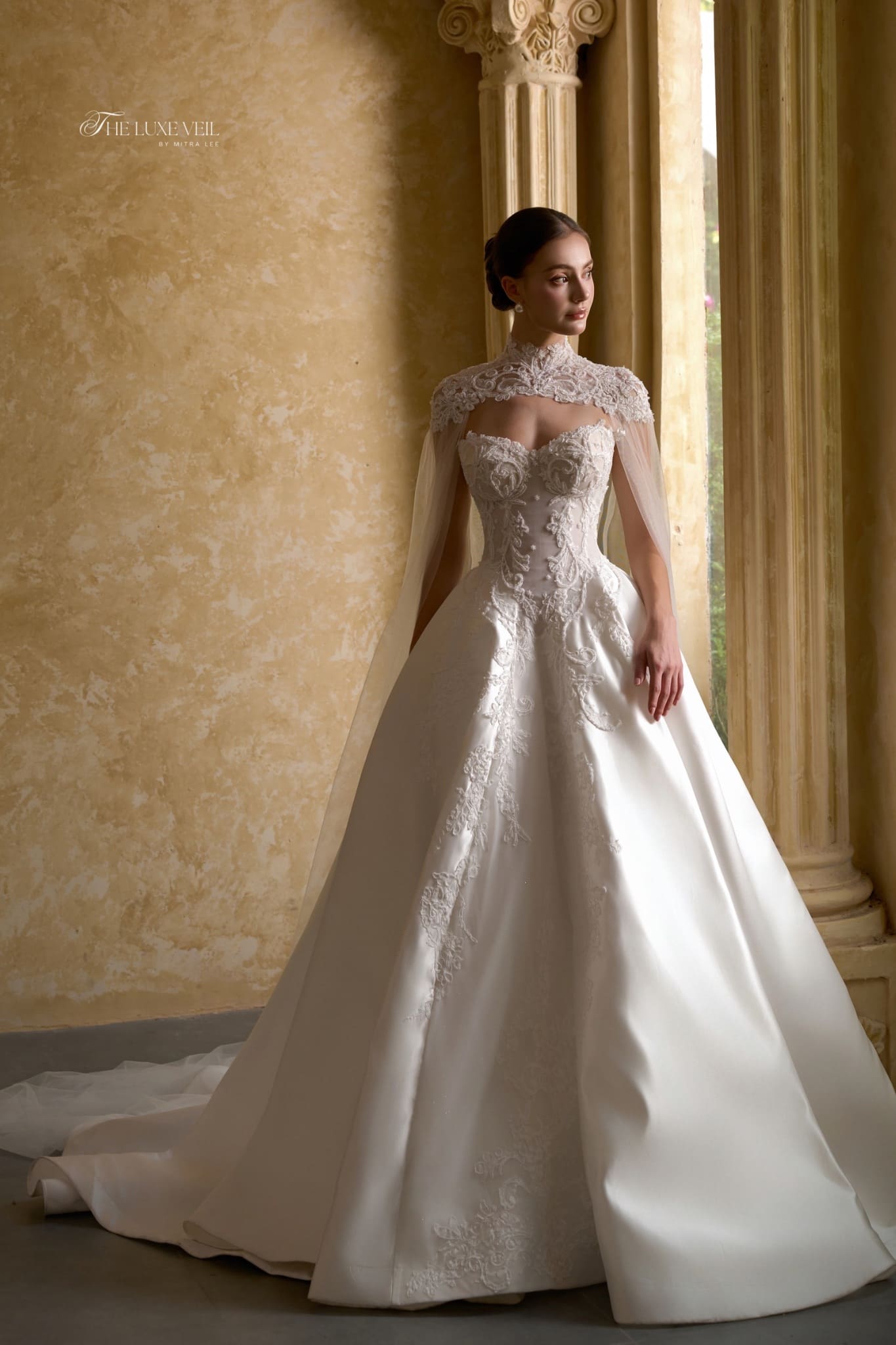Madeleine feels like a story whispered through palace halls. Delicate lace traces the bodice with old-world romance, rising gently into a refined neckline that frames the collarbone with grace and modesty. The structured corset shapes the waist with elegance, flowing into a full skirt that moves slowly, deliberately as if every step is meant to be remembered. Soft embroidery blooms across the gown, balancing tradition with tenderness. With the sheer cape drifting behind her, Madeleine becomes almost ethereal, a vision of devotion, poise, and quiet grandeur. Madeleine is for the bride who has always dreamed in fairytales. She believes in romance that lasts, in love that is patient, graceful, and forever.