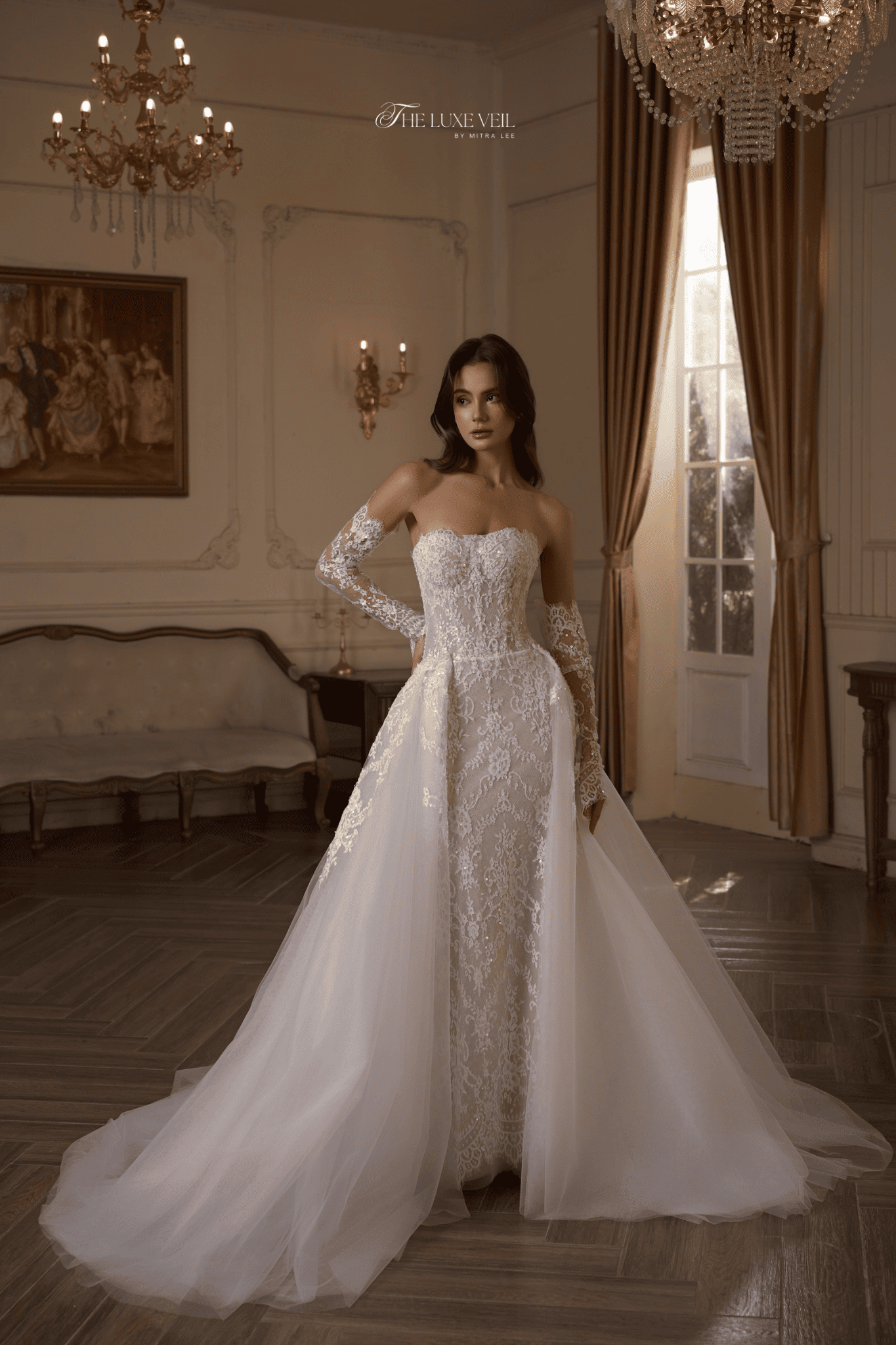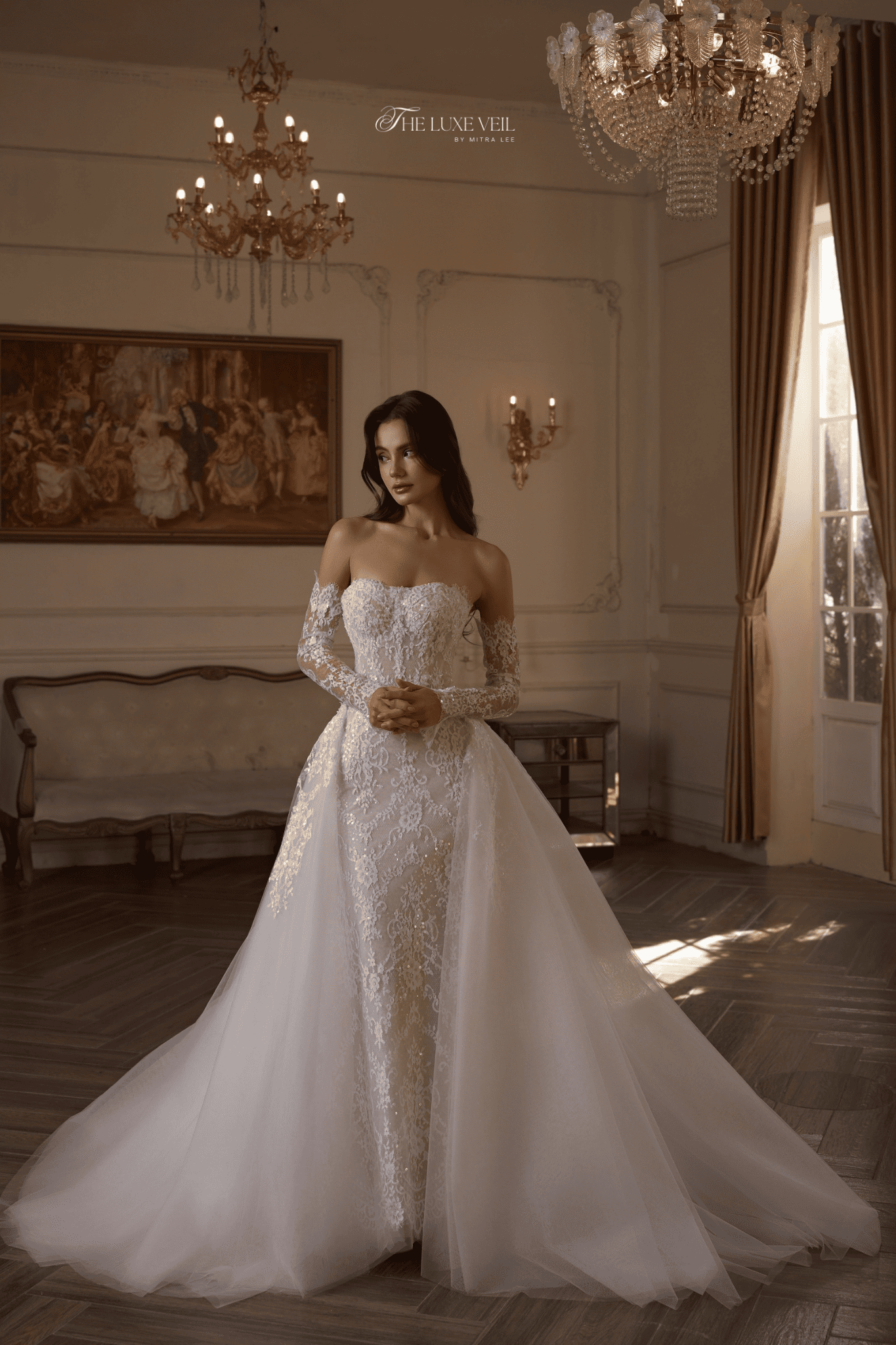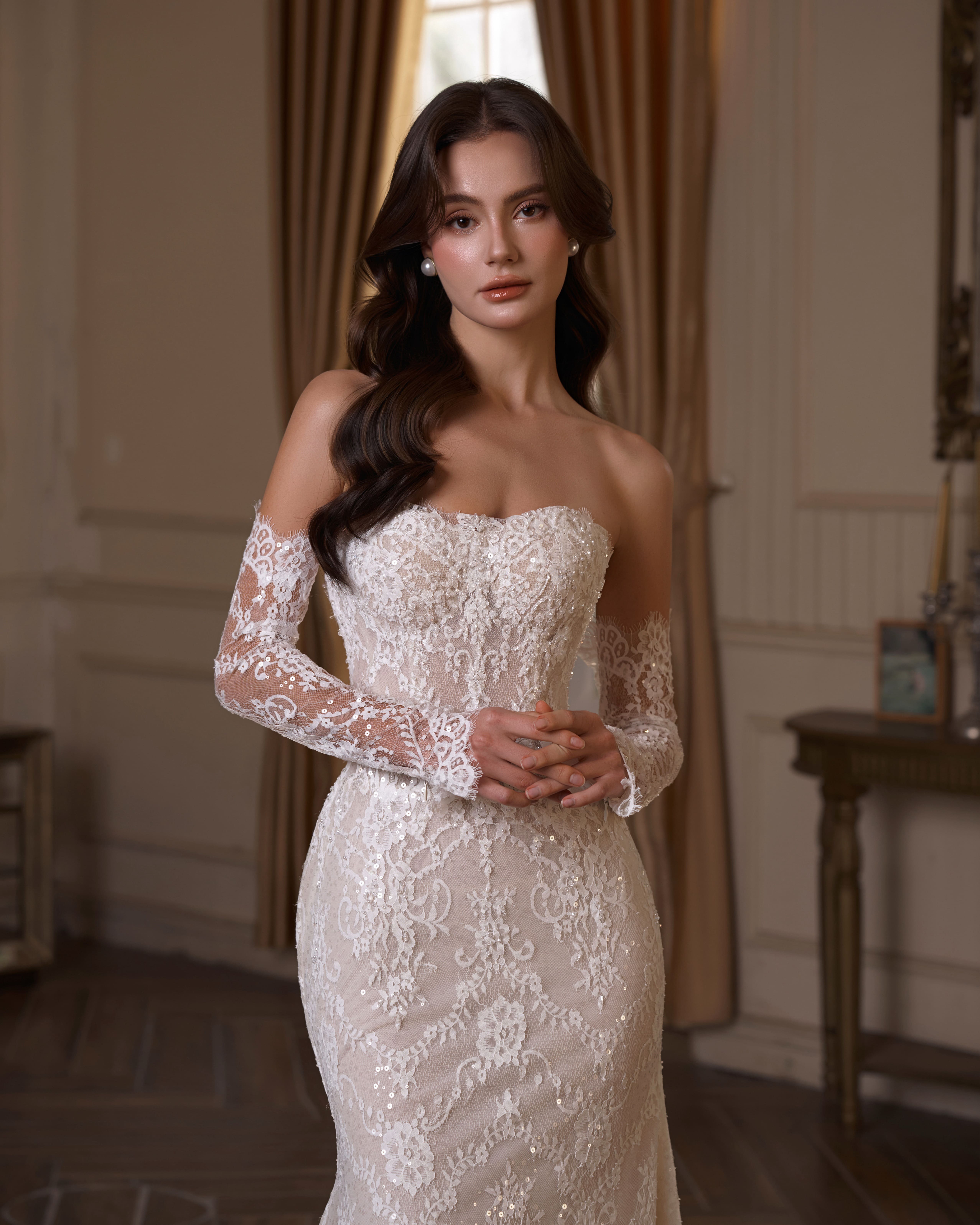Roselyn feels like a love story written in lace. Soft florals trace the gown with quiet romance, wrapping the silhouette in delicacy and warmth, as if every stitch was made with intention. The corseted bodice shapes the waist gently, while sheer lace sleeves soften the look with a vintage tenderness. Subtle shimmer catches the light as she moves, creating a glow that feels intimate, graceful, and effortlessly feminine. With a flowing overskirt trailing behind, Roselyn transforms — romantic yet confident, refined yet deeply emotional Roselyn is for the bride who believes in love that grows slowly and lasts forever. She doesn’t rush the moment. She lets it bloom.