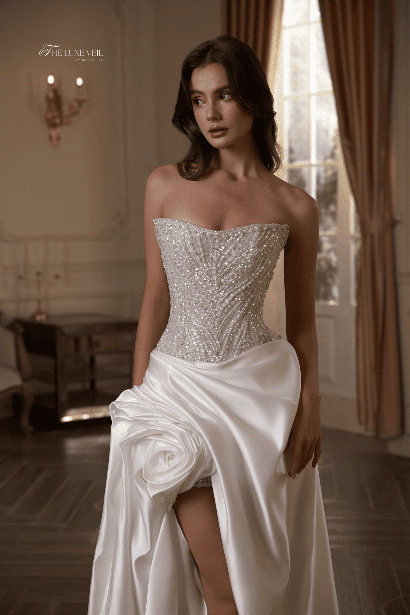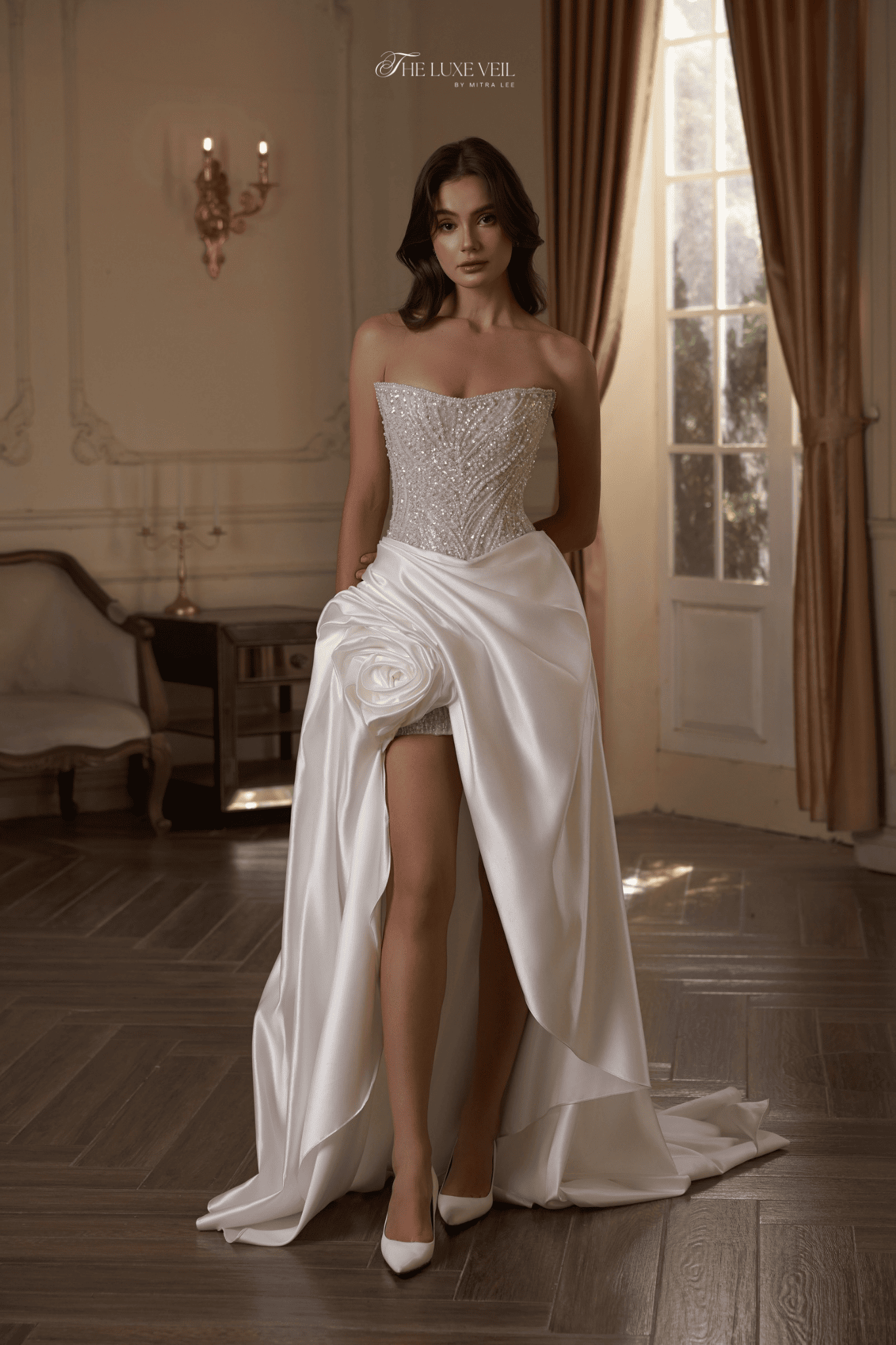 Blair is confidence, distilled. Sculpted beadwork traces the body with precision, catching the light with every movement: bold, seductive, and unapologetically modern. The corseted bodice defines the silhouette with strength, while the short length reveals a daring edge beneath the elegance. Finished with a dramatic satin overskirt, Blair transforms effortlessly: sleek by night, striking by design. This is a dress made for the after party 🥂 When the ceremony ends, and the bride steps into her power. Blair is for the bride who owns the room. She doesn’t wait for the moment — she is the moment.